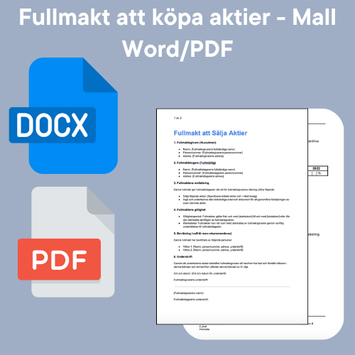 Having a clear and legally correct power of attorney to purchase shares is essential to protect your financial interests and ensure the smooth execution of your trades. Our template for authorization to buy shares is designed to meet all your needs and complies with Swedish laws and practices. Download your template today and get full control over your stock trading.