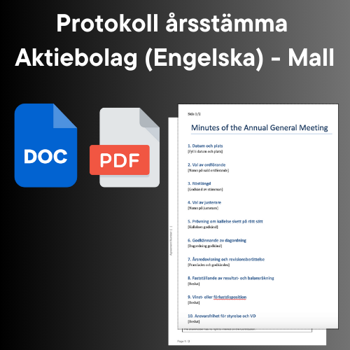 Vår dokumentmall för protokoll vid årsstämma i aktiebolag är utformad för att uppfylla alla krav enligt svensk lagstiftning och praxis, men på engelska. Denna mall är ett oumbärligt verktyg för företag som behöver dokumentera sina årsstämmor på ett korrekt och juridiskt bindande sätt.